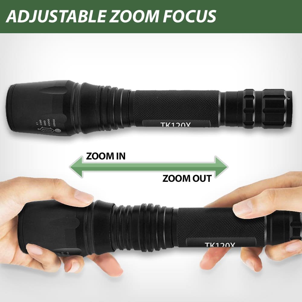 One of the important features of this LED flashlight is the zoom lens. It’s our best 18650 flashlight which is ideal for many situations from hunting and camping to security work. The Adjustable Focus Zoom on the TK120X LED Tactical Flashlight allows you to shine the light beam on a targeted area. It can even be something in the distance. You might need enhanced light on a moonless night to spot a deer or an owl in a tree. Security guards often need to see exactly what something is even in a dark warehouse. It might be a stray animal but it could be a thief. You need to know.
