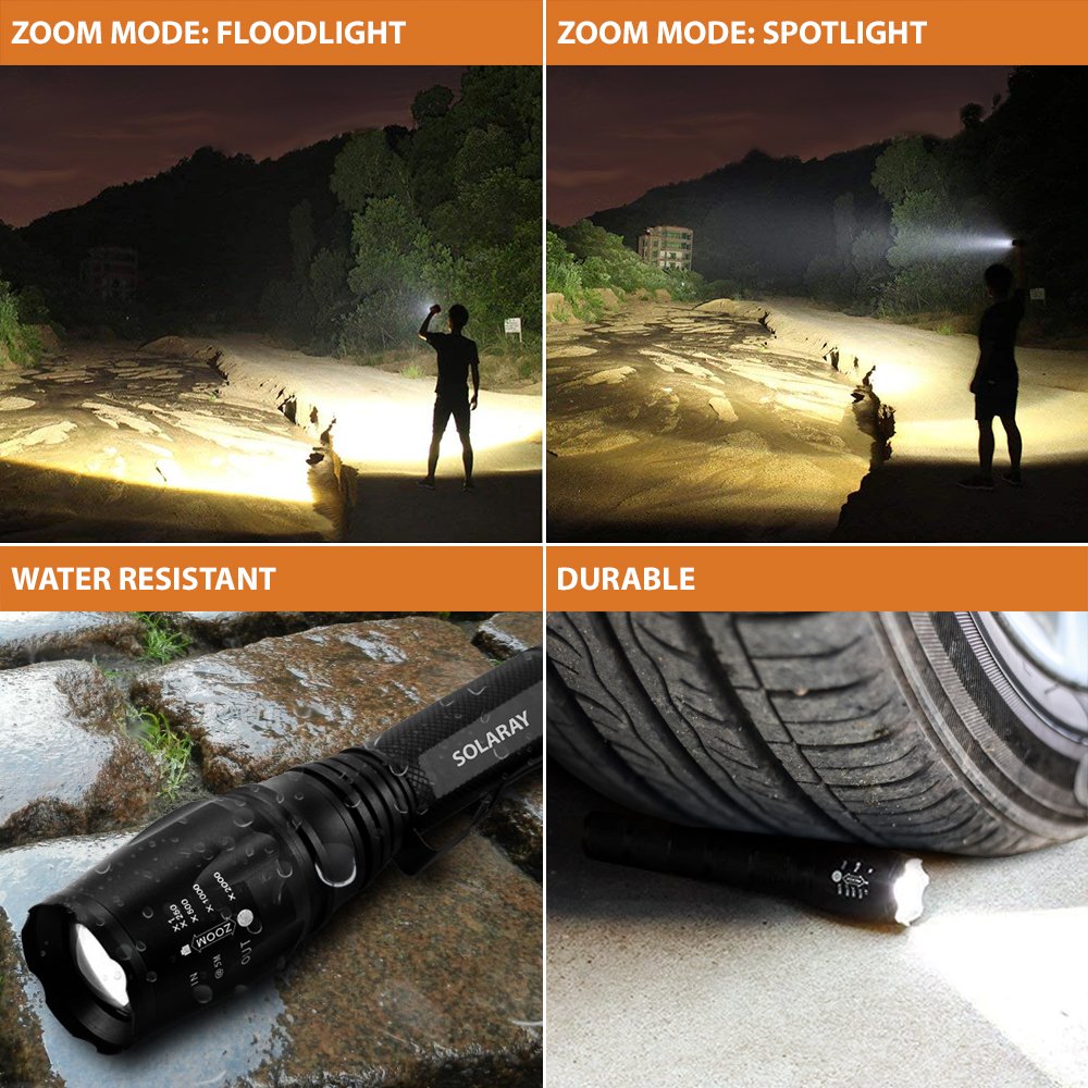 This unique 18650 LED flashlight has multiple light modes for use with the zoom feature. This gives you a truly adjustable focus that can be invaluable during emergencies like floods, earthquakes, hurricanes and tornadoes. Since the flashlight is made of an aircraft grade aluminum alloy, it has a hardened anodized finish that will withstand moisture, hard bangs and other heavy usage. This professional LED flashlight is a great choice for those working in the disaster industry.