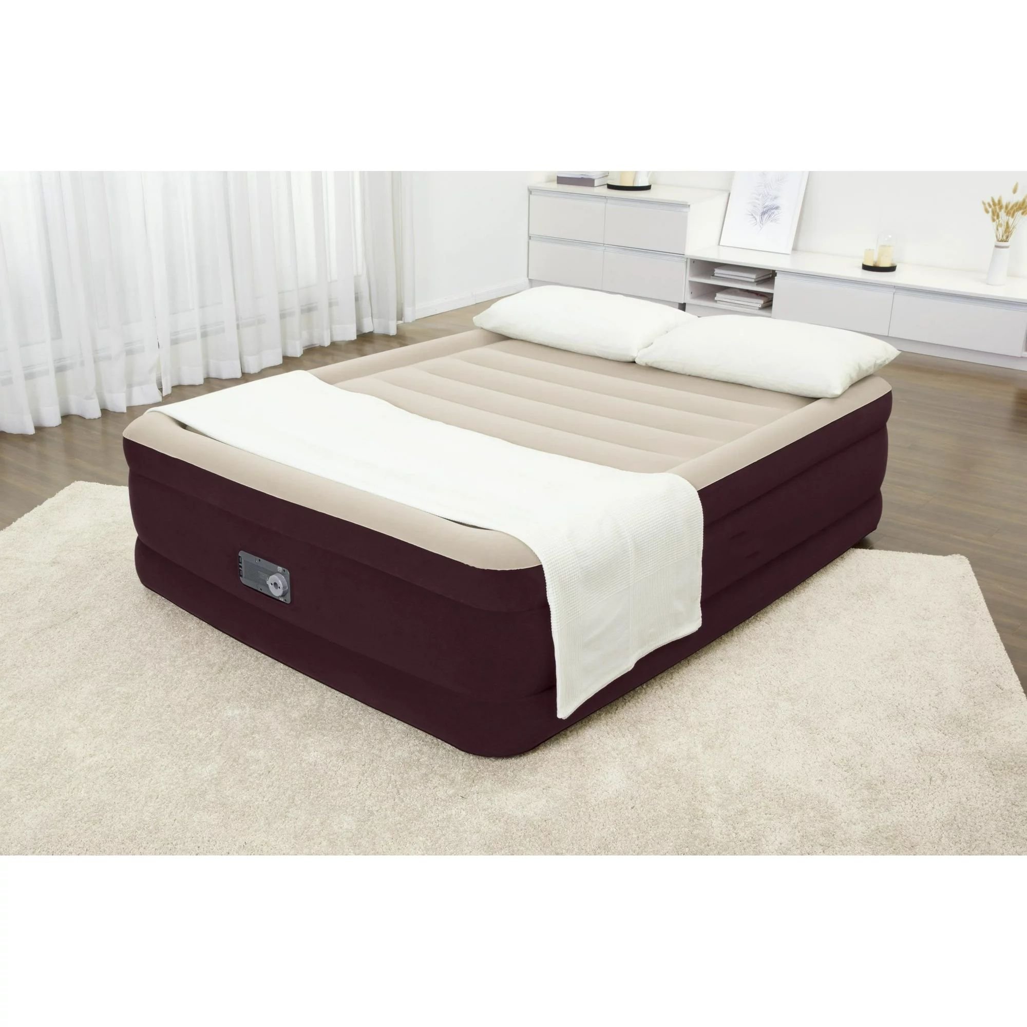 Wake up renewed and refreshed on the 20" Queen Air Mattress with Built-in Pump. This tall; queen-sized bed promises strength; durability; and comfort all night long. Its compact size and built-in pump make it quick and convenient for use whenever you need it. The trendy solid beige top elevates the luxurious look of this air mattress. Plus; with the Ultra-Fresh. antimicrobial surface; your bed will be protected from the growth of odor-causing bacteria; mold; and mildew on the sleep surface. This air mattress freatures tritech construction and can withstand the stress; weight and movement that comes with a good night sleep.